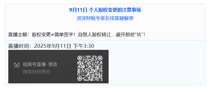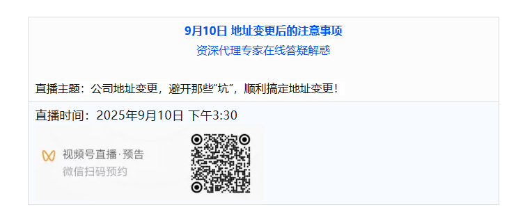 二場直播分別著力解決您的工商地址變更,自然人股東股權轉讓的關鍵問題。歡迎您的收看。